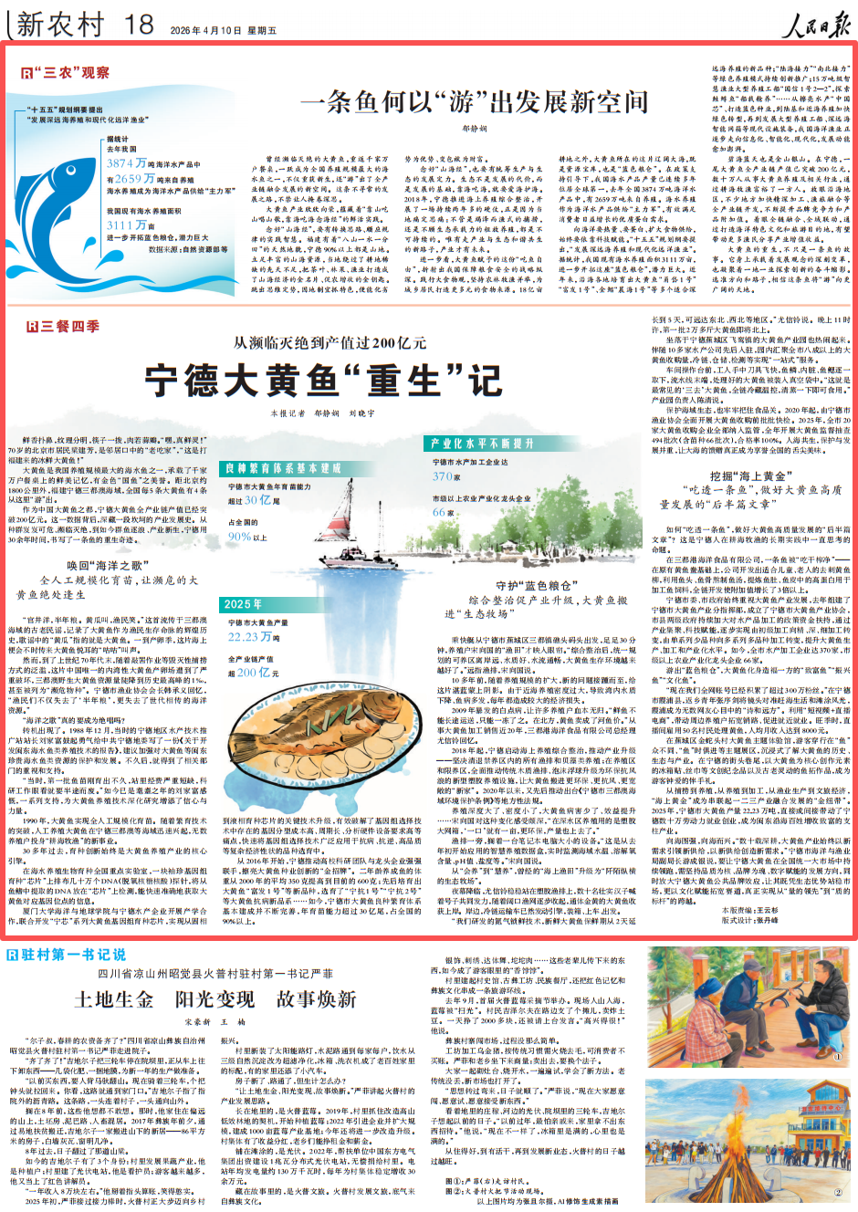 4月10日,新农村版“三餐四时”专栏刊发通信《宁德大黄鱼“”记》,并配发评论《一条鱼何故“逛”出成长新空间》。中国大黄鱼之都——福建宁德,让大黄鱼种群从朝不保夕、接近,到现在群鱼逐浪、财产重生,大黄鱼全财产链产值曾经冲破200亿元。
